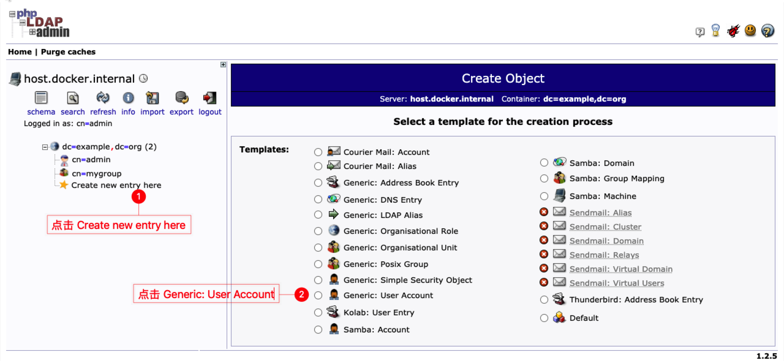 https://内网IP:6443,按下图所示步骤登录 phpLDAPadmin:字段名称 字段值 字段描述 Login DN cn=admin,dc=example,dc=org 默认管理员用户 Password admin 管理员密码
