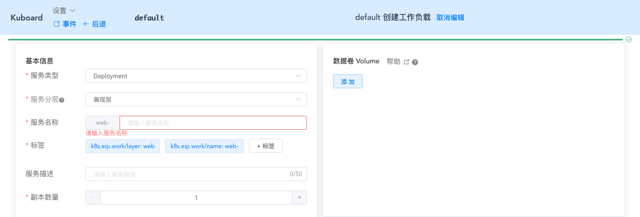 在 Kuboard 中创建工作负载时,工作负载的名字(服务名称字段)将作为 Deployment(StatefulSet/DaemonSet)的名字,也将作为 Service、Ingress 的名字
